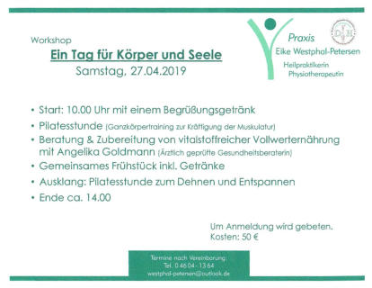 26.03.2020Schnelle Mittagsgerichte aus der Vollwertküche, Kurs: 35005Termin: Do, 26.03.2020, 18:30 bis 22:00 UhrDozentin: Angelika Goldmann, Ärztlich geprüfte Gesundheits-beraterin GGBKursort: Schulze-Delitzsch-Str.2, 24943 Flensburg, vhs-Zentrum Sandberg; Hauptgebäude A, KücheAnmeldung: VHS Flensburg, Tel: 0461 855000, E-Mail: volkshochschule@flensburg.deKosten: 19,00 €Die Gerichte werden einfach, lecker, gesund und schnell zubereitet. Sie sind vegetarisch und teilweise tiereiweißfrei. Bitte bringen Sie Kochschürze, Behälter für Kostproben und Geld für die Lebensmittelumlage mit, die Sie direkt bei der Kursleitung vor Ort entrichten.27.02.2020Gesunde vollwertige Gerichte aus dem Thermomix, Kurs: 35004Termin: Do, 27.02.2020, 18:30 bis 22:00 UhrDozentin: Angelika Goldmann, Ärztlich geprüfte Gesundheits-beraterin GGBKursort: Schulze-Delitzsch-Str.2, 24943 Flensburg, vhs-Zentrum Sandberg; Hauptgebäude A, KücheAnmeldung: VHS Flensburg, Tel: 0461 855000, E-Mail: volkshochschule@flensburg.deKosten: 19,00 €Mit dem Thermomix bereiten wir leckere Gerichte aus der vitalstoffreichen Vollwertküche zu. Die Gerichte sind vegetarisch und teilweise tiereiweißfrei.Bitte bringen Sie Kochschürze, den Thermomix, Behälter für Kostproben und Geld für die Lebensmittelumlage mit, die Sie direkt bei der Kursleitung vor Ort entrichten.02.09.2019Kurs: Rohkostwoche - alles roh, alles gut, alles frisch, Kurs 192-3070Termin: Mo, 02.09.2019 bis Fr. 06.09.2019, 18:00 bis 20 Uhr (am 2.9. etwa 30 Min. länger)Dozentin: Angelika Goldmann, Ärztlich geprüfte Gesundheits-beraterin GGBOrt: Alexander-Behm-Schule, Haus 5, siehe Anfahrt - Lageplan VHS-TarpAnmeldung: direkt über VHS-Tarp: www.vhs-tarp.de.Kosten: 5 Termine, Kursgebühr 29 €, Barzahlung Die Lebensmittelumlage von 38 € muss direkt an die Dozentin gezahlt werden.Iss roh, dann wirst du froh, iss kalt, dann wirst du alt! Gemeinsam schnippeln und genießen wir Salate, Smoothies, Suppen, Desserts, Kuchen, Brote, Brotaufstriche, und zwar ohne Kochen. In Frischkost stecken so viel mehr Vitalstoffe als in gekochter Kost und diese dienen uns für einen vitalen Start in das Winterhalbjahr. Rezepte und Ideen fürs Frühstück und Mittagessen begleiten die Kursteilnehmer durch den Tag.27.04.2019Workshop: „Ein Tag für Körper und Seele“Termin: Sa, 27.04.2019, 10:00 bis ca. 14:00 UhrOrt: Eike Westphal-Petersen, Neue Straße 48, 24969 Lindewitt (Linnau)Anmeldung:westphal-petersen@outlook.de oder Tel.: 04604 1364Kosten: 50 € pro PersonIm Rahmen eines Workshop „Ein Tag für Körper und Seele“ bei Eike Westphal-Petersen in Linnau werden zwei Pilatesstunden für Körper und Geist durchgeführt, außerdem erfahren sie eine Beratung und Zubereitung von vitalstoffreicher Vollwert-ernährung.Das Programm: •Start mit einem Begrüßungsgetränk•Pilatesstunde•Beratung und Zubereitung von vitalstoffreicher Vollwerternährung•Gemeinsames Frühstück inkl. Getränke•Pilatesstunde zum Dehnen und Entspannen25.04.2019Kurs: Die Vollwert-Kochschule "Ideen für den Sonntags-brunch", Kurs 191-3074Termin: Do, 25.04.2019, 18:30 bis 22 UhrOrt: Alexander-Behm-Schule, Haus 5, siehe Anfahrt - Lageplan VHS-TarpAnmeldung: direkt über VHS-Tarp: www.vhs-tarp.de.Kosten: 1 Termin, Kursgebühr 12 €, Barzahlung Die Lebensmittelumlage von 12 € wird direkt an mich gezahlt.Leckere Ideen für den vollwertigen Sonntagsbrunch. Bitte Schürze und Kostprobenbehälter mitbringen.14.03.2019Kurs: Die Vollwert-Kochschule "Praktische Wild-Küche", Kurs 191-3073Termin: Do, 14.03.2019, 18:30 bis 22 UhrOrt: Alexander-Behm-Schule, Haus 5, siehe Anfahrt - Lageplan VHS-TarpAnmeldung: direkt über VHS-Tarp: www.vhs-tarp.de.Kosten: 1 Termin, Kursgebühr 12 €, Barzahlung Die Lebensmittelumlage von 12 € wird direkt an mich gezahlt.Wildfleisch frisch und lecker zubereitet: Sie bekommen Tipps vom Fachmann für die Behandlung des Wildfleisches und der anschließenden Zubereitung. Für Vegetarier gibt es Alternativen.Bitte Schürze und Kostprobenbehälter mitbringen.27.02.2019Kurs: Schüßler Salze, Wirkung der verschiedenen SalzeTermin: Mittwoch, 27.02.2019, 19:00 bis 21:00 UhrOrt: Jugendtreff Oeversee, Stapelholmer Weg 39.Kosten: 7 € + 2 € für Kopien.Unser Leben befindet sich in einem ständigen Wandel. Damit unser Körper auf diesen Wandel reagieren kann, benötigt er ausreichend Mineralstoffe. Sind nicht genügend Mineralstoffe vorhanden, können Krankheiten oder gesundheitliche Störungen entstehen. Dr. W. H. Schüßler entdeckte die 12 Salze des Lebens. Die Schüßlersalze beeinflussen den gesamten Organismus. Die Anwendung ist einfach und das Wirkungsspektrum groß und vielfältig. Anmeldung: auf der Website vom Ortskulturring Oeverseeoder Mobil: 0152 5579787424.09.2018Kurs: Frischkostwoche - alles roh, alles gut, alles frisch, 182-3073Mo., 24.09.2018 bis Fr., 28.09.2018, 18:00 bis 20:00 Uhr(Am 24.9. 18 bis 20:30 Uhr), in der VHS Tarp.Kosten: 5 Termine, 29 € + Lebensmittelumlage 30 €, Barzahlung.Iss roh, dann wirst du froh, iss kalt, dann wirst du alt! Gemeinsam schnippeln und genießen wir Salate, Smoothies, Suppen, Desserts, Kuchen, Brote, Brotaufstriche… In Frischkost stecken so viel mehr Vitalstoffe als in gekochter Kost und diese dienen uns für einen vitalen Start in das Frühjahr! Rezepte und Ideen fürs Frühstück und Mittagessen begleiten die Kursteilnehmer durch den Tag.Ort: Alexander-Behm-Schule, Haus 5, siehe Anfahrt - Lageplan VHS-TarpAnmeldung direkt über VHS-Tarp: www.vhs-tarp.de.02.07.2018Seit Juli bin ich Ärztlich geprüfte GesundheitsberaterinGGB Biete Ernährungs- bzw. Gesundheitsberatung nach Dr. Max Otto Bruker, Lahnstein an.16.11.2017Kurs: Schüßler Salze, 172-304.3Am Do., 16.11.2017, 19:00 bis 21:15 Uhr, in der VHS Tarp,Kosten: 1 Termin, 7 € plus 2 € Kopierkosten, Barzahlung.Die 12 Salze des Lebens nach Dr. Wilhelm Heinrich Schüßler (1821 - 1898). Ein gestörter Mineralstoffwechsel der Körperzellen kann Ursache vielfältiger Krank
